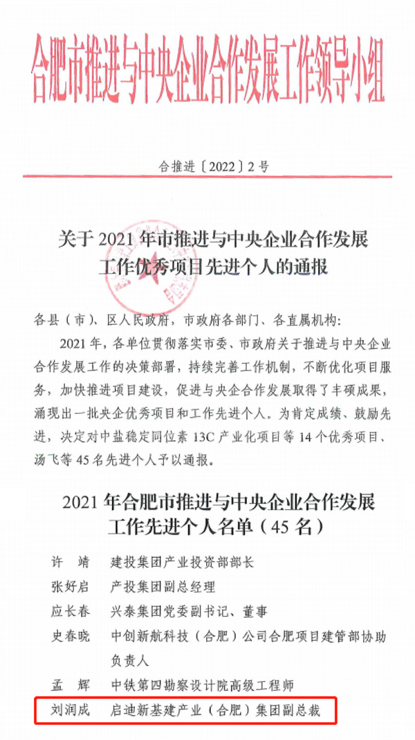 啟迪新基建副總裁劉潤(rùn)成獲評(píng)2021年度合肥市推進(jìn)與中央企業(yè)合作發(fā)展工作先進(jìn)個(gè)人稱號(hào)